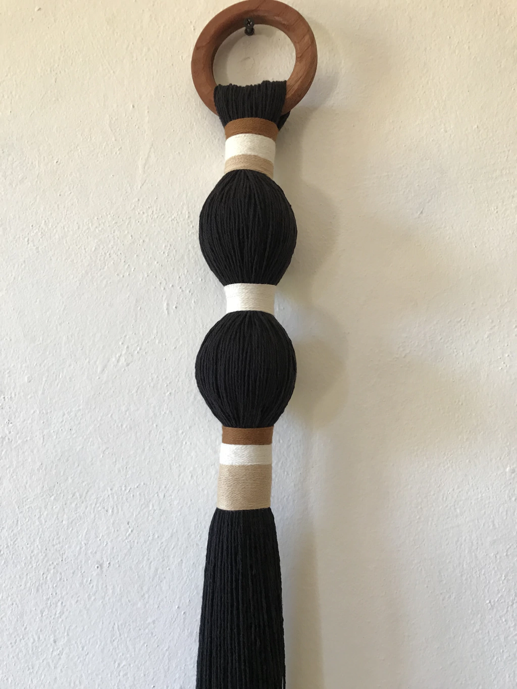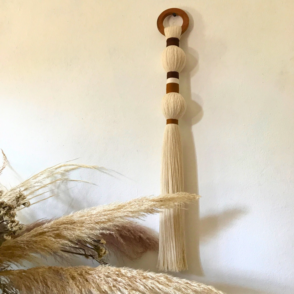 Descubri la belleza de nuestro tapiz para pared, realizado a mano con hilo de algodón color crudo de base, embarillado en tonos marrones.