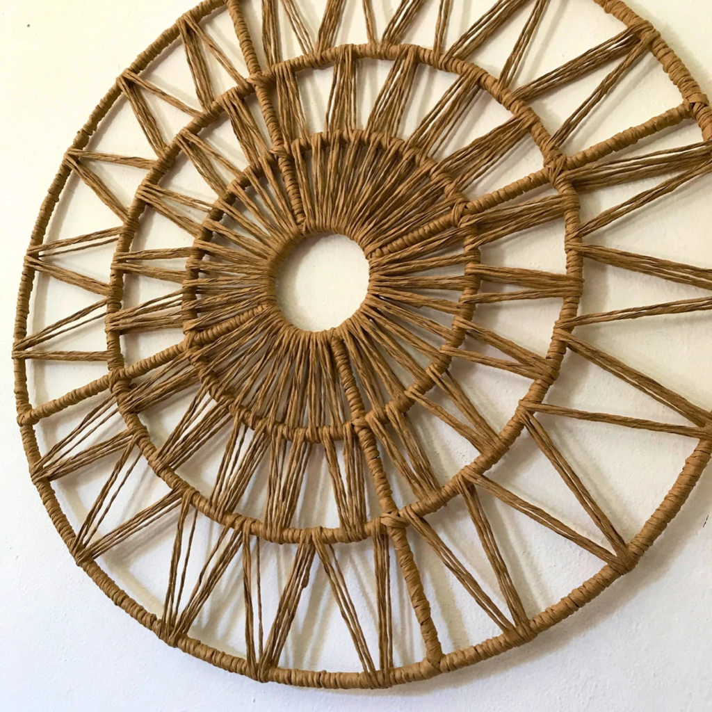 Transformá tus espacios con este hermoso tapiz circular de pared, tejido artesanalmente con hilo kraft color tostado. Cada pieza es única y está hecha con dedicación, aportando un toque cálido y acogedor a cualquier ambiente.