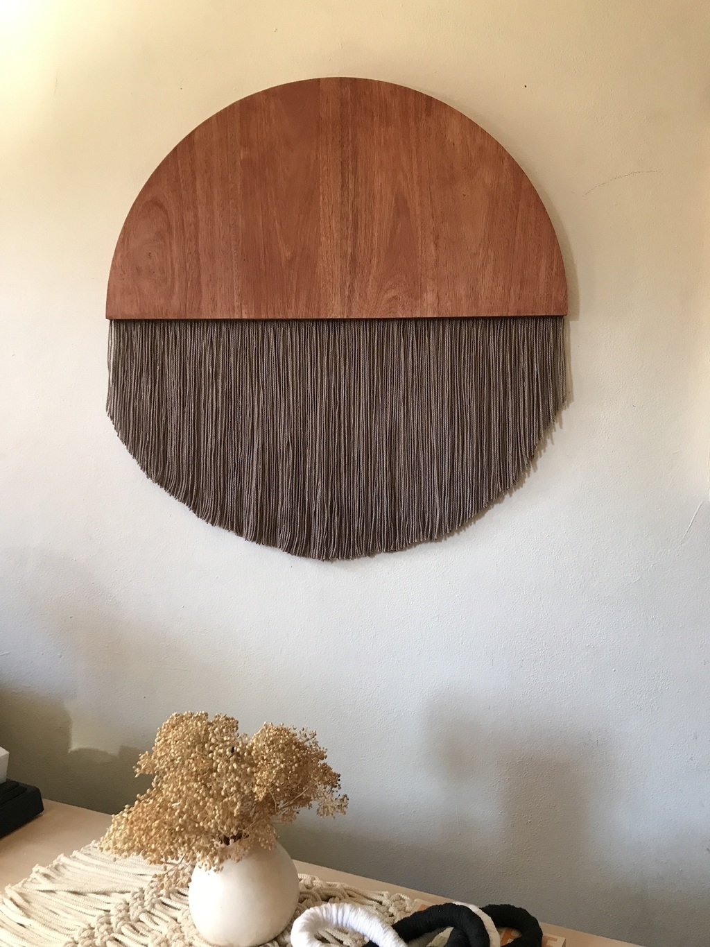 Tapiz realizado a mano en lana color visón y semicírculo macizo de madera de eucalipto teñido.